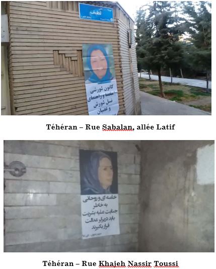 Ce 31 décembre 2019, des unités de résistance ont affiché des portraits et des messages de Maryam Radjavi, présidente élue du CNRI, et de Massoud Radjavi, dirigeant de la Résistance iranienne, dans diverses parties de Téhéran, notamment dans les rues Qodoussi, Qasr, Khajeh-Nassir-Toussi et Sabalan, ainsi que dans la ville de Qods.