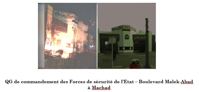 Par ailleurs, dans les premières heures du 20 janvier 2020, de jeunes insurgés ont visé le QG de commandement des forces de sécurité de l’Etat sur le boulevard Malek-Abad à Machad.