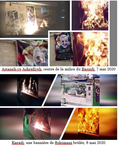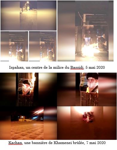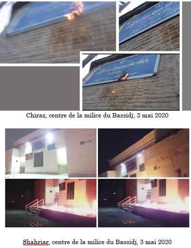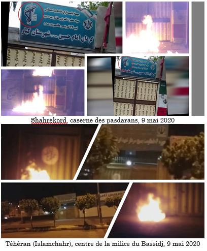 La semaine dernière, des jeunes ont incendié les entrées des centres du Corps des gardiens de la révolution et de la milice du Bassidj à Islamshahr, Shahrekord, Astaneh-ye Ashrafiyeh, Shahriar, Chiraz et Ispahan. Au petit matin du 9 mai 2020, ils ont incendié les portes de la caserne des pasdarans à Shahrekord. Simultanément, la porte de la base du Bassidj à Islamshahr a été incendiée.