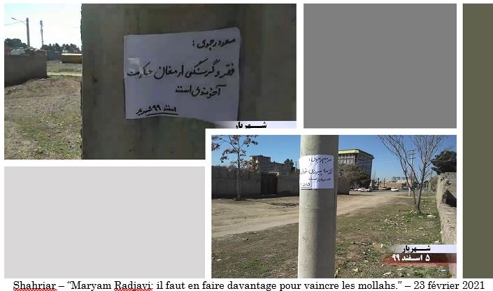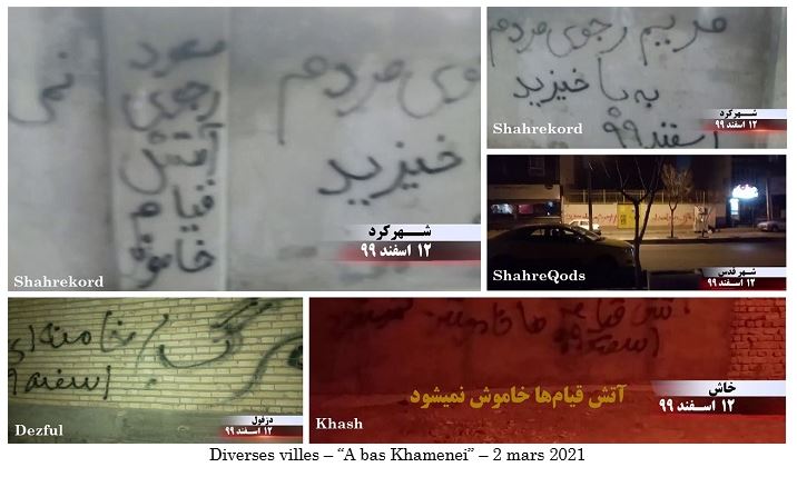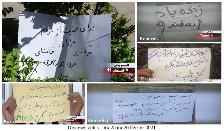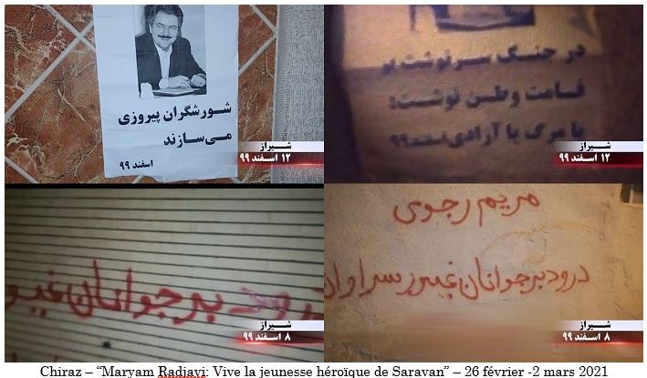 Les habitants de Saravan et d’autres villes du Sistan-Baloutchistan se sont soulevés pour protester contre la répression et le massacre des petits transporteurs de carburant et de jeunes épris de liberté de Saravan, de Zahedan et d’autres villes de la province. Outre Téhéran, les partisans de l’OMPI et les unités de résistance ont mené leurs activités à Tabriz, Kermanchah, Karaj, Qazvin, Kazeroun, Sanandaj, Arak, Iranchahr, Boroujen, Zahedan, Konarak, Chiraz, Zanjan, Machad, Yazd, Behbahan, Sari, Ahvaz, Shahriar, Chahrekord, Khash, Ilam, Racht, Dezfoul, Shahr-e-Rey et la ville de Qods.