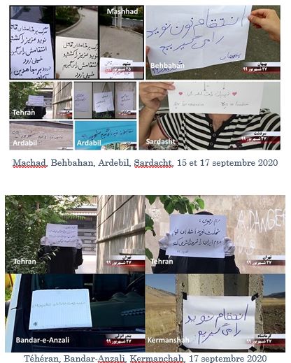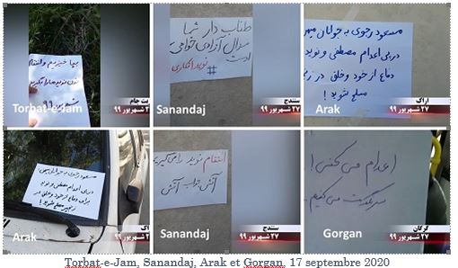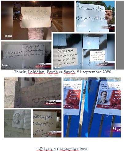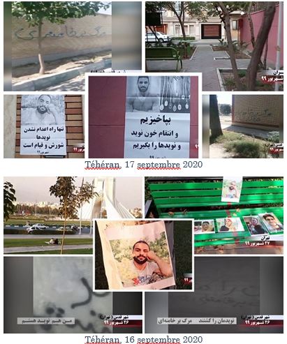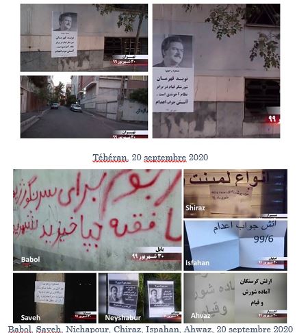 Au cours de la semaine dernière, des unités de résistance en Iran ont inscrit des slogans et collé des affiches et des tracts dans diverses villes, pour dénoncer l’exécution criminelle des manifestants emprisonnés Mostafa Salehi et Navid Afkari et la condamnation à mort d’autres manifestants arrêtés. Ces activités se sont déroulées à Téhéran et en province comme à Chiraz, Chahr-e-Qods, Saveh, Tabriz, Ispahan, Lahidjan, Behbahan, Paveh, Racht, Nichapour, Machad, Qouchan, Qom, Doroud, Kazeroun, Hamedan, Ahwaz, Babol, Sardasht, Bandar Anzali, Ardebil, Arak, Torbat-e Jam, Sanandaj, Gorgan, Kermanchah.