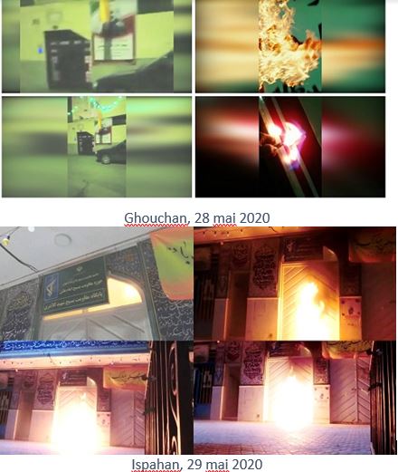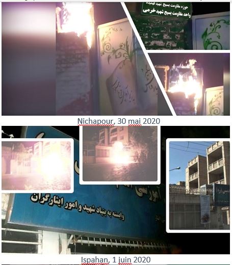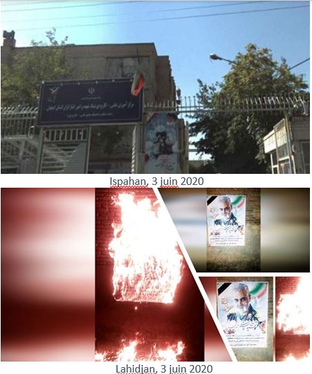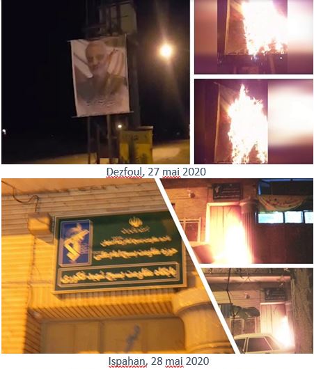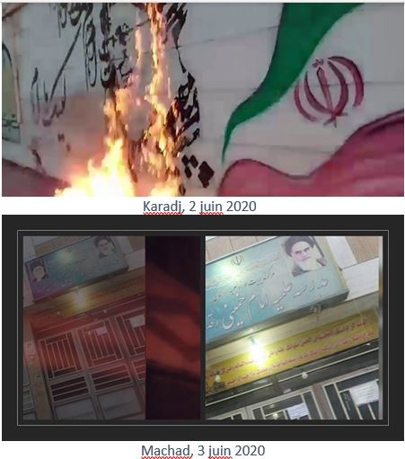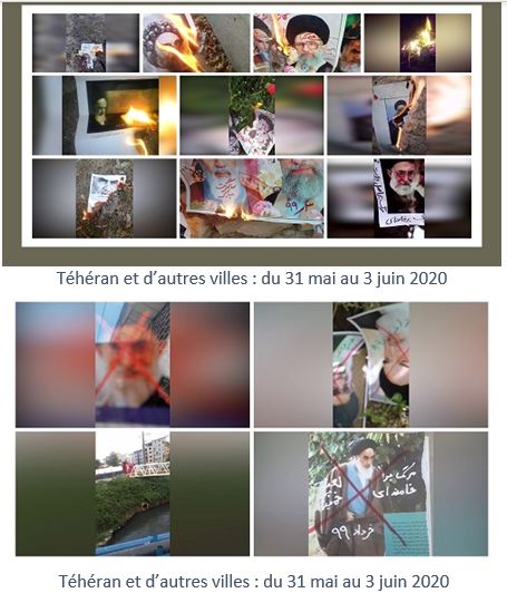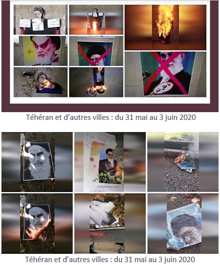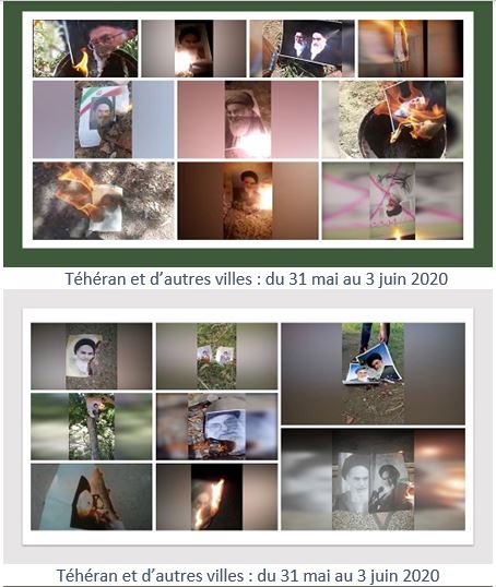 De plus, du 31 mai au 4 juin, à l’occasion de l’anniversaire de la mort de Khomeiny, de jeunes insurgés ont brûlé ses portraits dans beaucoup de villes comme Téhéran, Karadj, Machad, Ahwaz, Tabriz, Roudsar, Kerman, Racht, Kermanchah, Yazd, Oroumieh, Nochahr, Mazandaran, Sirjan, Qom, Qazvine, Lorestan, Bandar-Anzali, Hachtpar, Khaf, Behbahan, Chouchtar, Roudbaraz, Varbar Javanroud, Ardebil, Hamedan, Zahedan, Bandar Abbas et Chahriar.
