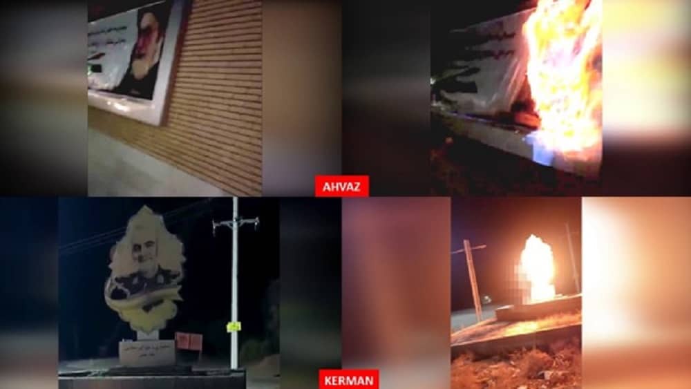 En outre, des panneaux et des bannières du gouvernement avec des portraits de Khomeiny, Khamenei, Ebrahim Raïssi et Qassem Soleimani ont été incendiés à Ahwaz, Machhad, Oroumieh, Kerman, Babol, Behchahr, Qaen et Aligoudarz..