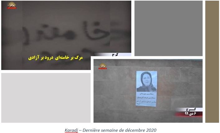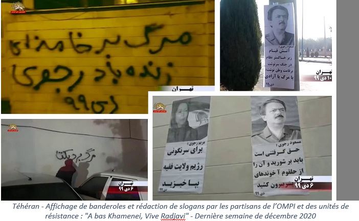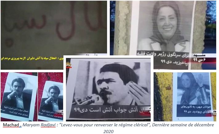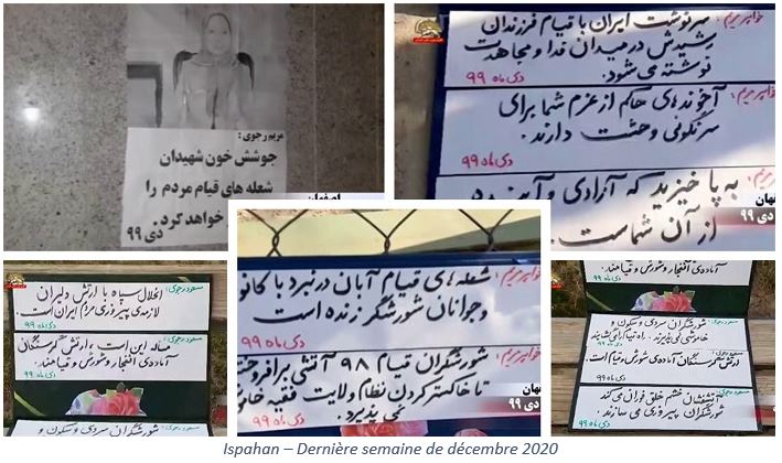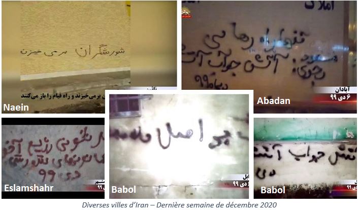 On pouvait lire notamment sur les murs et les bannières : « Massoud Radjavi : la dissolution des pasdarans est impérative pour la victoire du peuple iranien », « A bas Khamenei, vive Radjavi », « La rébellion est déterminante dans la guerre contre le régime des mollahs », « Les mollahs doivent disparaitre pour que le coronavirus disparaisse », « A bas Khamenei et Rohani, source de coronavirus et ruine », « Massoud Radjavi : L’armée des affamés est prête pour la révolte et le soulèvement », « Maryam Radjavi : Le sang des martyrs attisera la flamme du soulèvement du peuple iranien », « A bas le dictateur », « Maryam Radjavi : Les mollahs au pouvoir sont terrifiés par votre détermination à changer de régime. »