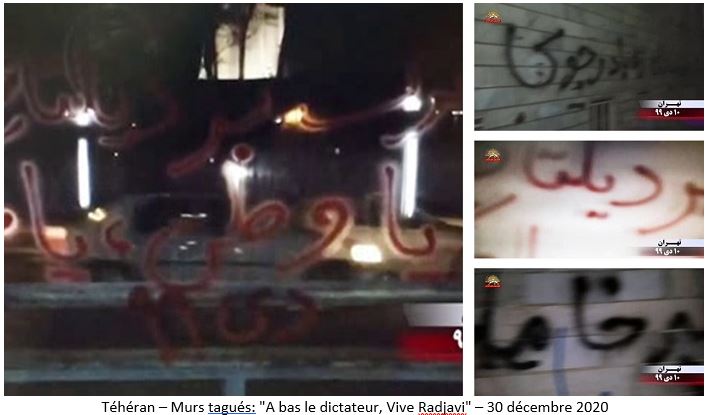 Durant la dernière semaine de décembre, les unités de résistance et les partisans des Moudjahidine du peuple (OMPI/MEK) ont affiché des tracts et des pancartes dans plusieurs villes d’Iran. Ils ont également taggué les murs dans des zones très fréquentées, faisant passer des messages des dirigeants de la Résistance iranienne appelant les Iraniens à se lever pour la liberté.