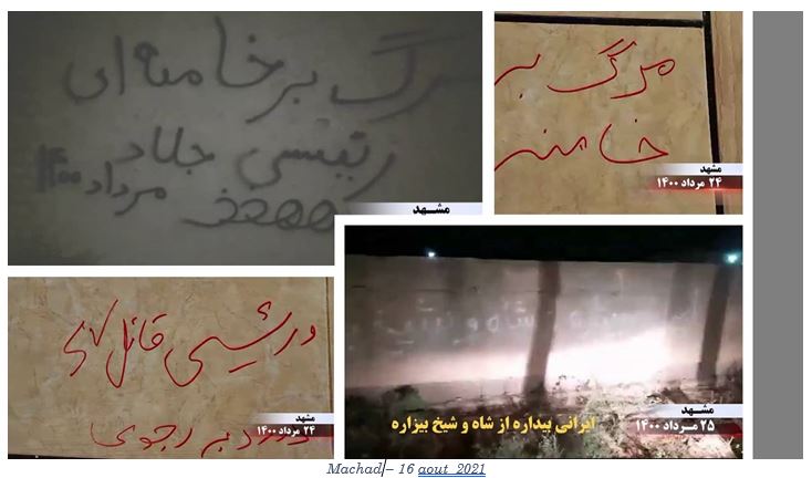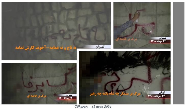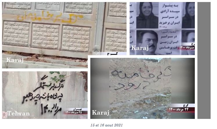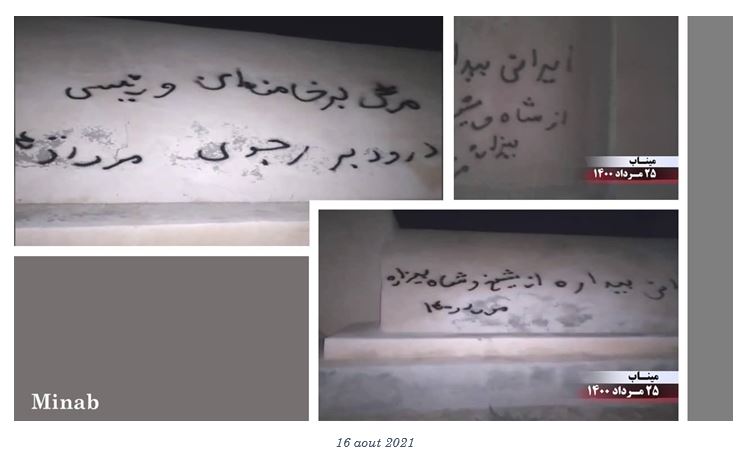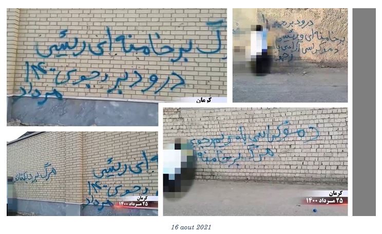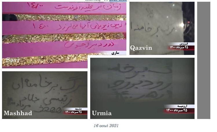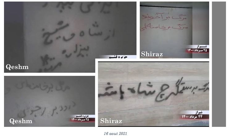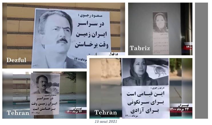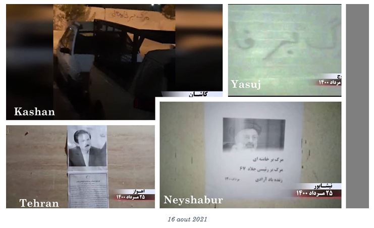 Les 15 et 16 août 2021, les unités de la Résistance et les sympathisants des Moudjahidine du peuple d’Iran (OMPI/MEK) dans diverses villes ont affiché des banderoles et des pancartes et écrit des graffitis pour diffuser les messages des dirigeants de la Résistance iranienne (Maryam Radjavi, présidente élue du Conseil national de la Résistance iranienne (CNRI), et Massoud Radjavi, dirigeant de la Résistance iranienne) sur l’installation d’Ebrahim Raïssi, le bourreau du massacre de 1988, à la présidence du régime. Ils ont également appelé à manifester et à s’insurger pour mettre fin à la dictature des mollahs et instaurer un Iran libre et démocratique. Les activités des partisans de l’OMPI et des unités de résistance ont eu lieu à Téhéran, Karadj, Ispahan, Ahwaz, Kerman, Tabriz, Qazvine, Chiraz, Machad, Kachan, Nichapour, Sari, Oroumieh, Yassoudj, l’île de Qeshm, Minab, Bouchehr et Dezfoul.