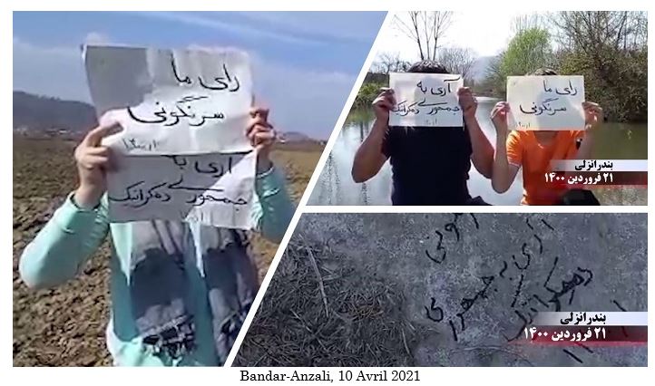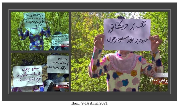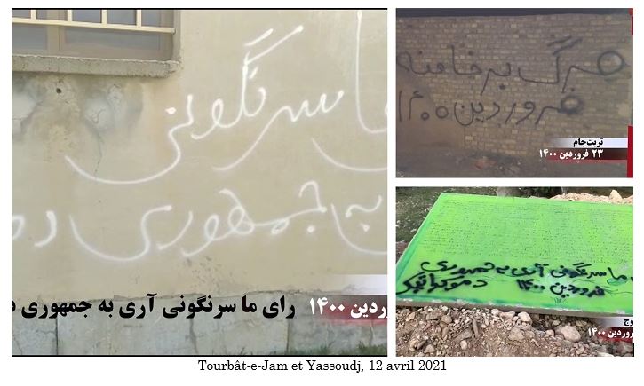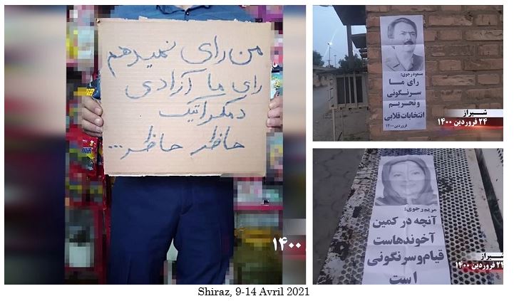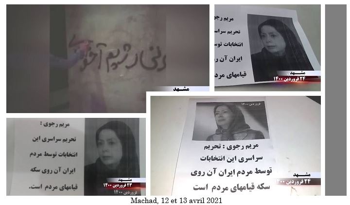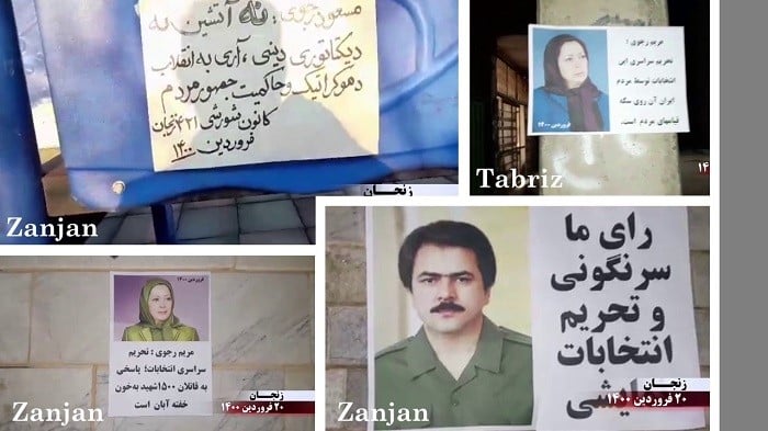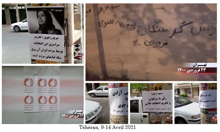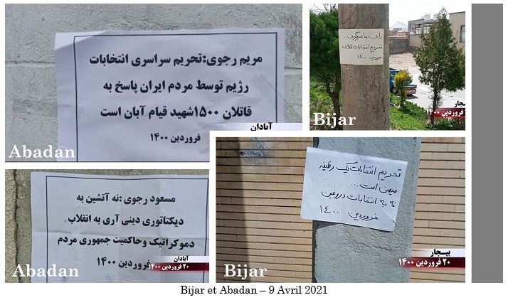 Les slogans sur les affiches, les graffitis et les banderoles appelant au boycott de la comédie électorale de la dictature religieuse comprenaient : « Maryam Radjavi: Le boycott national des élections est une réponse aux assassins des 1500 martyrs du soulèvement de novembre », « Maryam Radjavi: Le boycott national de cette élection par le peuple iranien est l’autre face des soulèvements populaires », « Massoud Radjavi : Non à la dictature religieuse, oui à une république démocratique », « Massoud Radjavi : nous votons pour le renversement et le boycott des fausses élections », « Vive l’Armée de la liberté en Iran, nous votons pour le renversement, oui à une république démocratique », « Ce qui guette les mollahs est un soulèvement et leur renversement », « Démocratie, liberté avec Maryam Radjavi », « A bas Khamenei, vive la liberté », « La farce de l’élection présidentielle n’a aucune légitimité aux yeux du peuple iranien », « L’armée des affamés avance vers l’insurrection et le soulèvement » et « A bas à Khamenei, qui a vendu l’Iran ».