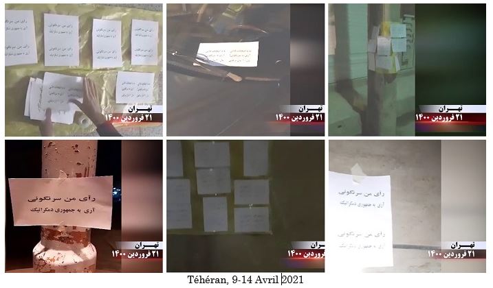 Du 9 au 14 avril 2021, les partisans des Moudjahidine du peuple d’Iran (OMPI/MEK) et les unités de résistance ont appelé à un boycott massif de la farce électorale de la présidentielle des mollahs en plaçant des banderoles et des affiches, en taguant des slogans dans les lieux publics et en distribuant des tracts. Les activités des partisans de l’OMPI et des unités de résistance se sont déroulées dans divers secteurs de Téhéran, ainsi qu’à Ispahan, Karadj, Ahwaz, Abadan, Machad, Chiraz, Racht, Tabriz, Zandjan, Kermanchah, Yazd, Kerman, Ilam, Qazvine, Khorramabad, Bandar-Anzali, Tonekabon, Yassoudj, Torbat-e Jam, Birjand, Bijar et Nichapour, Langroud et Boukan.