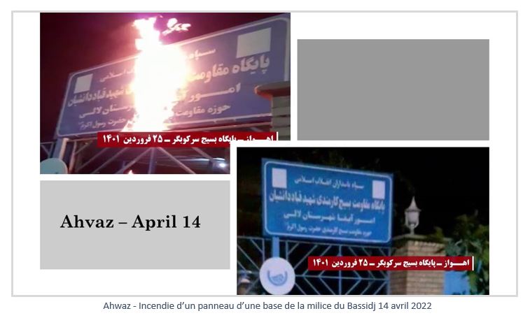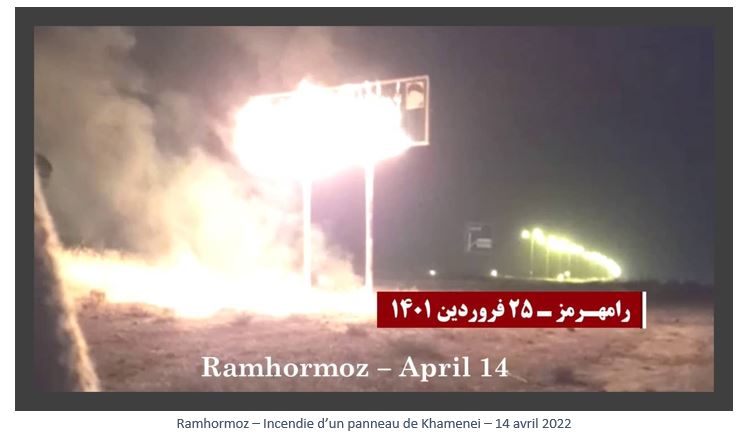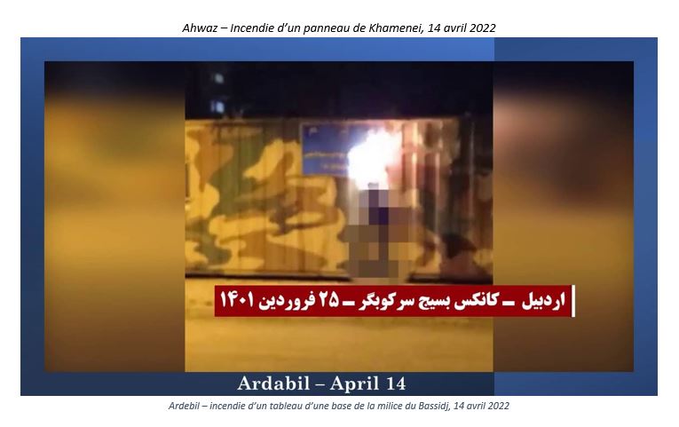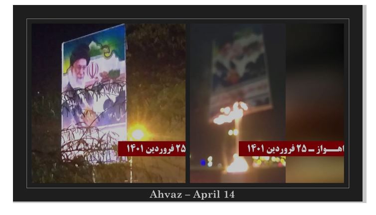 Le 14 avril 2022, de jeunes insurgés ont incendié des photos de Khamenei et de Qassem Soleimani (le commandant éliminé de la Force Qods), ainsi que des panneaux indiquant des centres répressifs et de pillage du régime, à Téhéran, Eslamshahr, Ardebil, Qazvine, Hamedan, Kamyaran, Kavar (Fars), Ahwaz, Andimeshk, Ramhormoz, Kerman et Zabol.