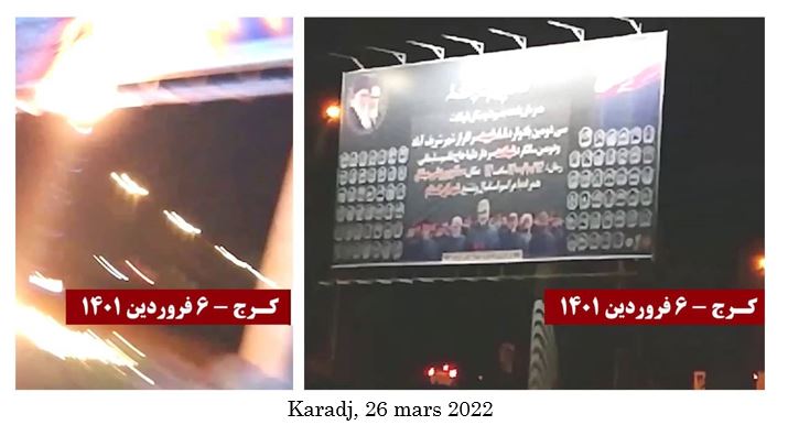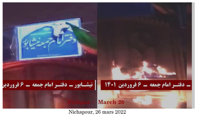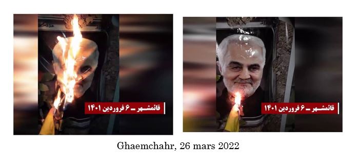 En réponse au tabassage d’une femme démunie à Dezfoul par les agents répressifs de Khamenei le 16 mars 2022, de jeunes insurgés à Téhéran, Ghaemchahr, Nichapour, Karadj, Ispahan, Chiraz, Kerman, Ahwaz, Chouchtar, Bandar Abbas, Kavar (province de Fars) et Khash ont incendié des portraits de Khomeiny, Khamenei et Qassem Soleimani et des panneaux de centres de la milice du Bassidj.