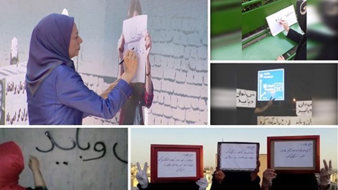 Parmi les slogans on pouvait lire : « Maryam Radjavi : Les commanditaires du massacre de 30 000 militants de l’OMPI doivent être traduits en justice », « Maryam Radjavi : La jeunesse insurgée s’inspire des héros du massacre de 1988 », « Ni oubli, ni pardon pour le massacre des prisonniers sans défense de 1988 », « Il faut juger les auteurs et les commanditaires du massacre de 1988, un cas manifeste de crime contre l’humanité », « Le sacrifice des martyrs du massacre de 1988 inspire les insurgés d’aujourd’hui », « Le massacre de 1988 est le plus grand crime contre l’humanité resté impuni », « Massoud Radjavi : Les unités de résistance vont triompher », « Maryam Radjavi : notre engagement est de restaurer les droits du peuple qui lui ont été enlevés », « A bas Khamenei, Vive Radjavi », « Nous soutenons les grèves des travailleurs », « A bas l’oppresseur, qu’il soit chah ou mollah », « Vive Mostafa Salehi, martyr du soulèvement ».