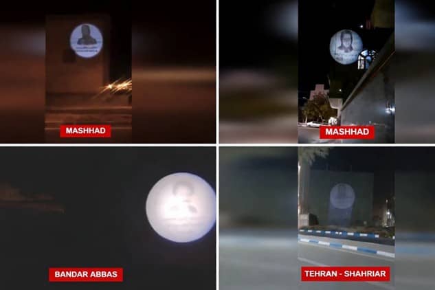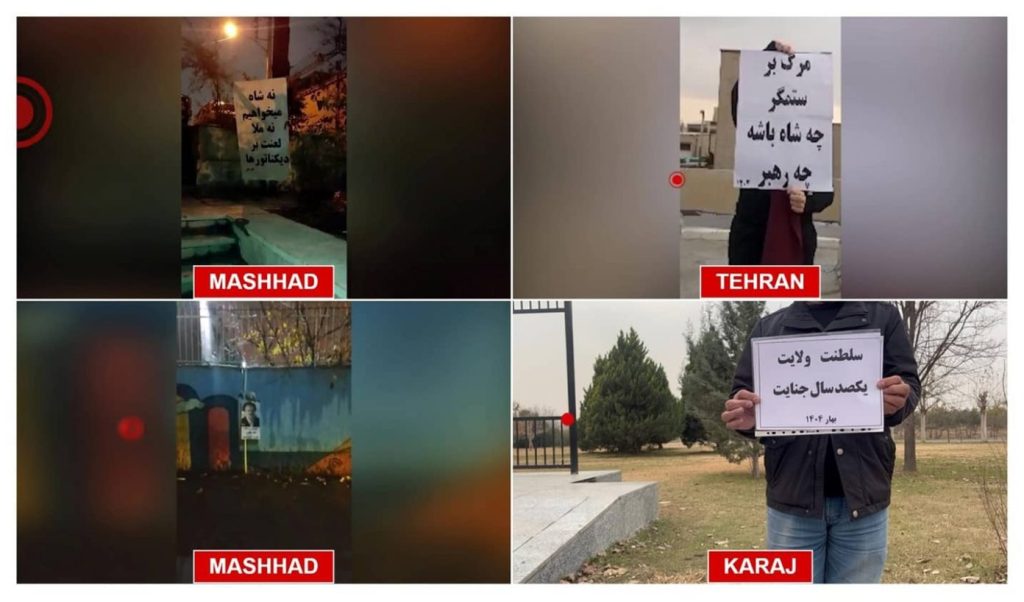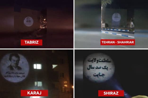 Neuf projections murales ont été menées à Machhad (boulevard Pirouzi, rue Palestine et boulevard Saremi), Bandar Abbas (rue Kharazmi et rue Meraj), Tabriz (Farhang-chahr), sur l’autoroute Chiraz-Fassa, Chahriar (rue Jouybar) et Karadj (boulevard Kadj) avec le slogan « Ni chah ni mollahs », traçant une claire démarcation contre toutes les formes de dictature. Au cours de ces actions audacieuses, des portraits des dirigeants de la Résistance, Massoud et Maryam Radjavi, ont été projetées sur les murs dans des zones très fréquentées, accompagnées de slogans tels que « A bas le tyran, qu’il soit chah ou mollah », « régime monarchique, régime clérical : cent ans de crimes », « La dictature est la dictature, avec un turban ou une couronne » et « comme pour le régime du chah, la fin des mollahs est arrivée ».