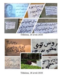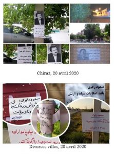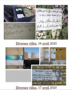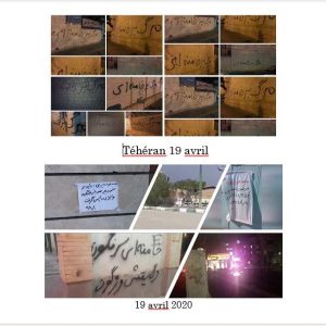 On pouvait lire sur les murs : « Armée des affamés, en avant vers le soulèvement ! », « il faut réduire en poussière les centres des pasdarans inhumains », « pour vaincre, il faut se révolter et se battre 100 fois plus », « Massoud Radjavi : Il faut mettre les moyens des pasdarans, de l’armée et du gouvernement au service de la population », « Maryam Radjavi : Il faut mettre à la disposition du peuple les immenses moyens médicaux et financiers des pasdarans et de l’appareil de Khamenei », « le virus disparaitra quand les mollahs partiront », « tant que les pasdarans du crime et de la guerre seront là, il y aura l’injustice des mollahs et de la dictature religieuse », « le peuple et les insurgés en Iran ont décidé de renverser les pasdarans et la milice cruelle du Bassidj », « Maryam Radjavi : malgré toutes ces souffrances, le printemps de la liberté viendra », et « A bas Khamenei ! Vive Radjavi ! »