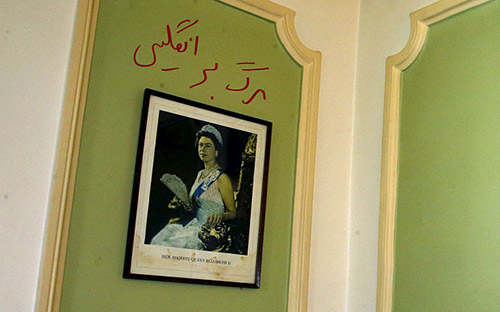 Un graffiti en persan proclamant « Mort à l’Angleterre » peut être aperçu au-dessus d’une photographie de la reine à l’ambassade britannique à Téhéran