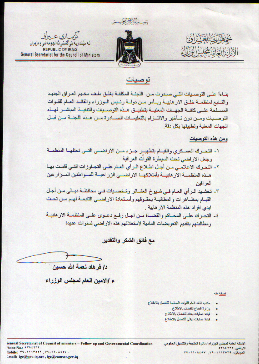 Selon cette lettre, Maliki a donné l’ordre aux attaquants de faire croire que ces terrains appartenaient à des agriculteurs et auraient été saisi de force par l’OMPI. Il a également ordonné de déposer des plaintes en justice contre les Achrafiens, et que les chefs de tribu de la province de Dyala soient contraints de manifester contre Achraf.