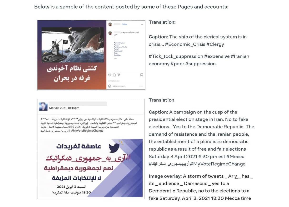 Pour cette raison, Facebook a affirmé avoir supprimé 128 comptes, 41 pages, 21 groupes et 146 comptes Instagram qui ciblaient des publics internationaux, dont l’Iran. Le raisonnement ridicule était le suivant : « Nous avons trouvé ce réseau dans le cadre de notre enquête interne et l’avons lié à l’OMPI, un groupe d’opposition iranien militant en exil et désormais basé en Albanie ». Le même rapport souligne : « Nous n’avons pas vu de preuve d’utilisation de l’automatisation pour faire fonctionner ces actifs. Nos propres systèmes automatisés ont désactivé certains des comptes pour (…) violence et incitation ».
