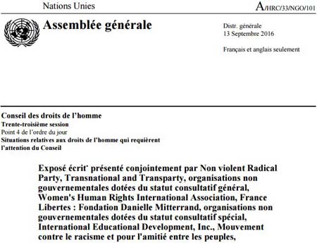 Dans une déclaration présentée conjointement par France Libertés : Fondation Danielle Mitterrand, le Mouvement contre le racisme et pour l’amitié entre les peuples (MRAP), le Women’s Human Rights International Association, le International Educational Development, le Non violent Radical Party et le Transnational and Transparty, les organisations non gouvernementales dotées du statut consultatif général auprès des Nations-unis, ont écrit :