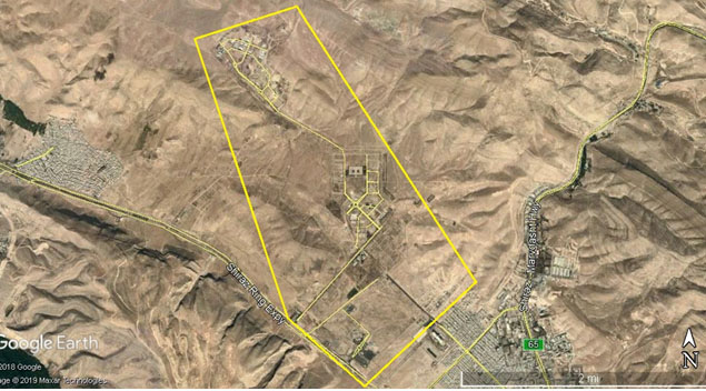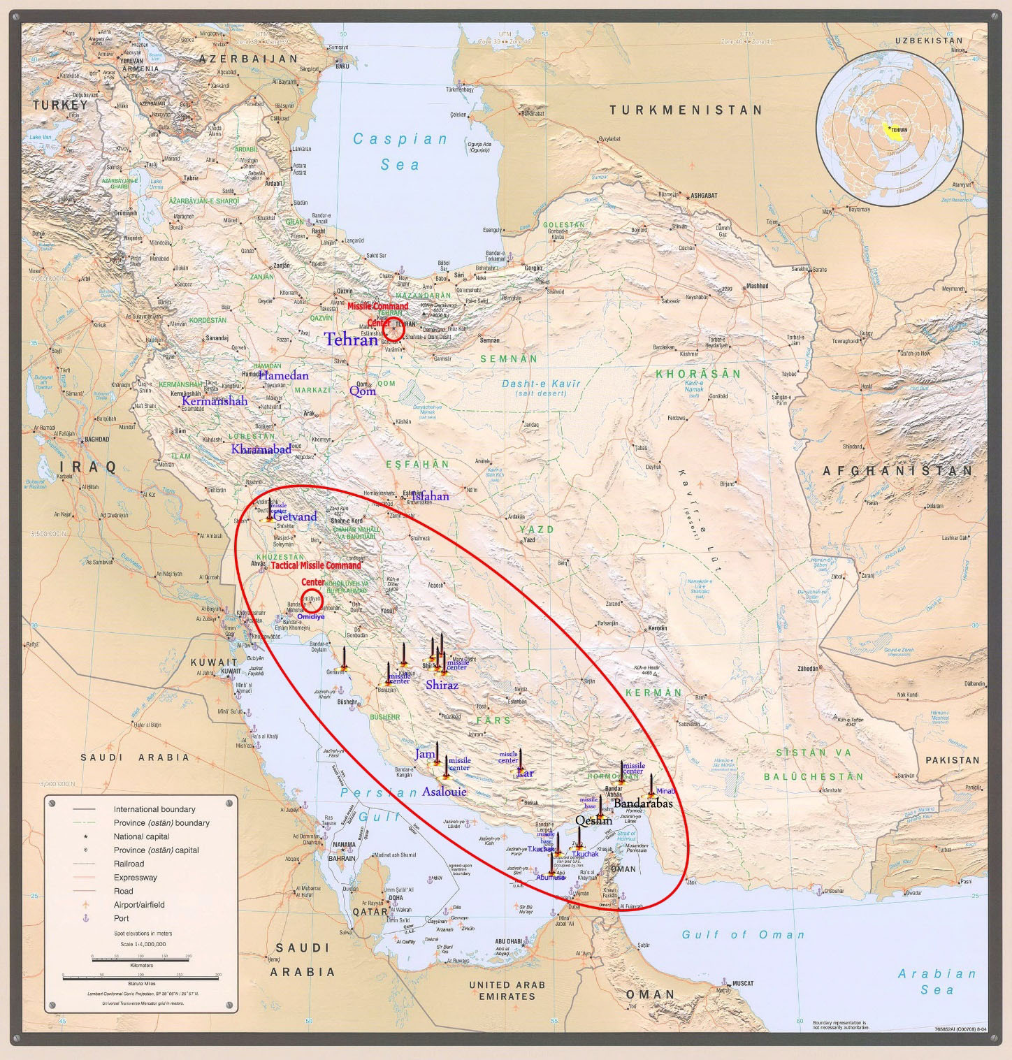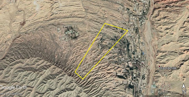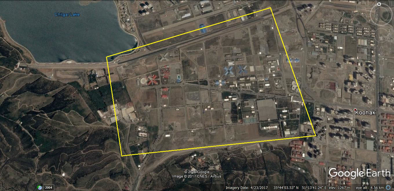 Description : L’installation se compose de trois bases situées l’une à côté de l’autre. La longueur totale de l’installation est de 7 kilomètres. Les dépôts de munitions construits par les ingénieurs des pasdaran pour contenir les missiles sont situés à l’extrémité nord de l’installation, de même que les rampes de lancement de missiles.