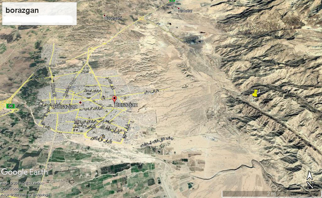 Emplacement : Au nord-est de Borazjan, sur la route menant à l’usine d’asphalte à l’est de Borazjan, après la base des pasdaran ; après avoir traversé cette base, la route s’étend sur environ 5 kilomètres jusqu’à l’entrée du tunnel.
