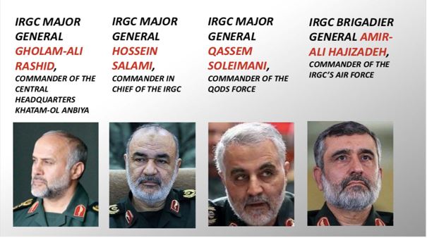 • Le général de division Gholam-Ali Rashid, commandant du QG central Khatam-ol Anbiya (plus haut quartier instance militaire opérationnel en Iran, chargé de la coordination opérationnelle entre toutes les forces armées du régime, notamment les pasdaran et les forces armées régulières)