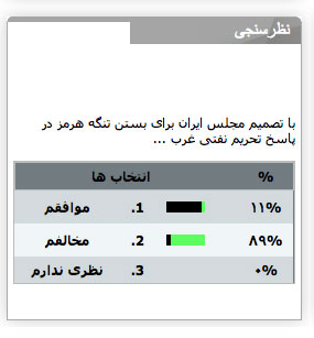 Le sondage a disparu après qu’il a été largement relayé par les médias iraniens basés à l’étranger. Il a été remplacé par un autre sondage sur la fermeture du détroit aux pétroliers faisant cap vers l’Union européenne, proposée par une centaine de députés iraniens, à laquelle 89 % des sondés se sont opposés. Ce dernier sondage a lui aussi disparu, laissant la place à une question sur le football.