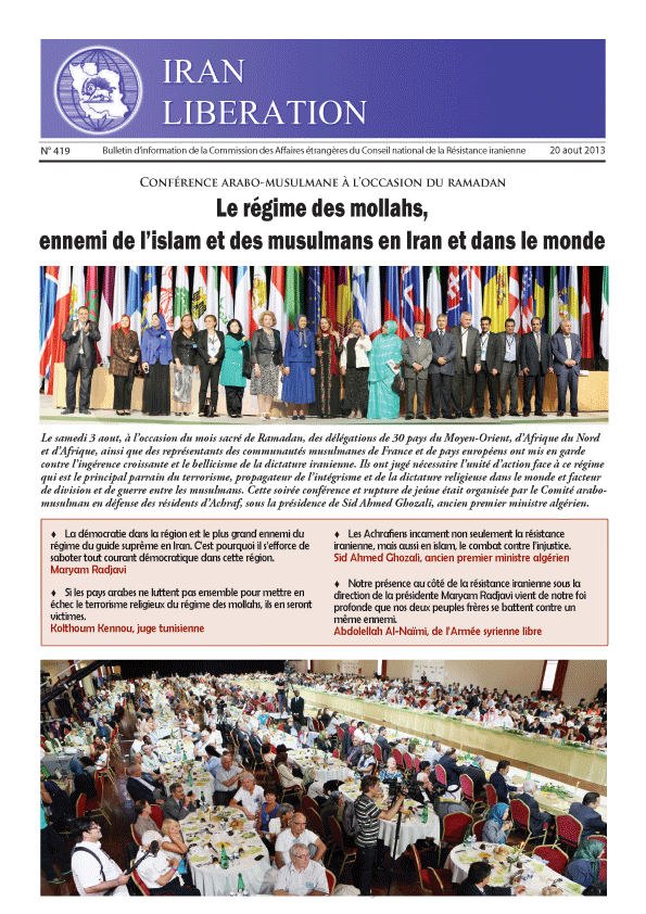 AccueilPublicationsPublications: Iran LibérationNouveau numéro d’Iran Libération: 419 Publications: Iran Libération Nouveau numéro d’Iran Libération: 419 Par Staff Writer 15 novembre 2013 Facebook Twitter Pinterest LinkedIn Conférence arabo-musulmane à l’occasion du ramadan 2013 Iran Libération N° 419 Pour Télécharger, clickez ici Article précédentLe bilan des cent jours du mandat d’Hassan RohaniArticle suivantIran Libération N° 423 : Appel à la communauté internationale pour sauver les otages d’Achraf et protéger Liberty Articles relatifs Publications: Iran Libération Iran Libération : Des dizaines de milliers d’Iraniens manifestent à Berlin pour une république démocratique la rédaction - 5 avril 2026 Publications: Iran Libération Iran libération : L’union des générations dans la bataille pour la liberté en Iran la rédaction - 5 avril 2026 Publications: Iran Libération « Iran Libération » numéro 473 : Pour stopper le soulèvement, le régime doit en éteindre les deux forces motrices la rédaction - 16 janvier 2023