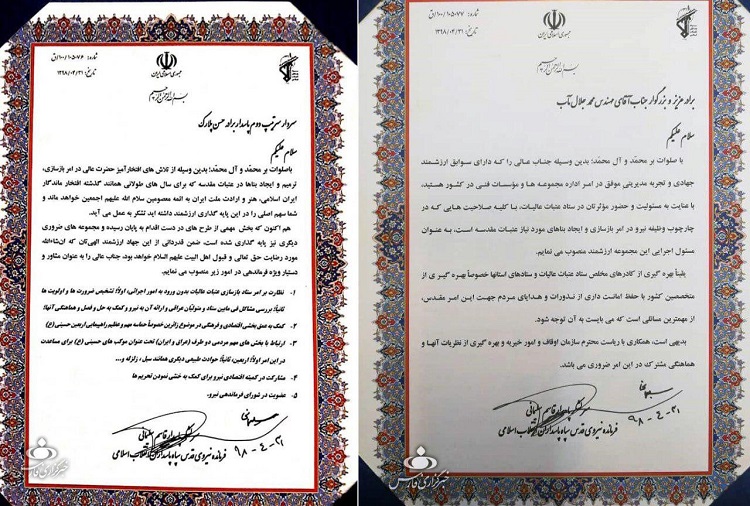 Puisque vous avez terminé une partie importante des plans que vous aviez en main, et que d’autres complexes cruciaux sont établis, exprimant ma gratitude pour votre précieux travail djihadiste que Dieu et Ahl-ol Beyt [famille du prophète de l’Islam, particulièrement les dirigeants chiites] acceptent, je vous désigne comme conseiller spécial du commandement de la force Qods pour les questions suivantes.