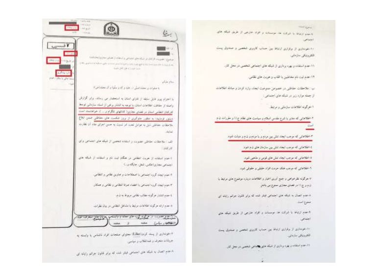 • « Interdiction d’adhérer à « tout groupe hostile (sur Internet) affilié à des courants politiques et contre-révolutionnaires déviants, s’abstenir de fournir des « informations organisationnelles », des « informations qui provoquent des tensions au sein de la population ou entre le peuple et les forces armées et le gouvernement » et des « informations qui provoquent des tensions entre les organisations des forces armées. » »