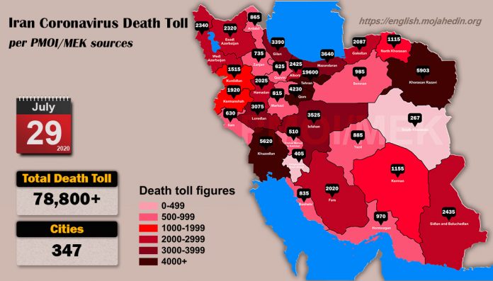 L’Organisation des Moudjahidine du peuple d’Iran (OMPI/MEK) a annoncé le 29 juillet, que le nombre de décès causés par le Covid-19 dans 347 villes d’Iran a malheureusement dépassé les 78.800 personnes. Le nombre de victimes dans les provinces de Téhéran est de 19.600, de Khorassan-Razavi 5903, de Mazandaran 3640, d’Azerbaïdjan oriental 2320, de Fars 2020, de Kerman 1155, de Yazd 885, d’Ardebil 865, de Markazi 815, de Zanjan 735, d’Ilam 630, de Chaharmahal-Bakhtiari 510 et de Kohkilouyeh-Boyer-Ahmad 405.