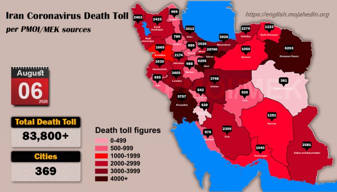 L’Organisation des Moudjahidine du peuple d’Iran (OMPI/MEK) a annoncé le 6 août 2020 que le nombre de décès dus au coronavirus dans 369 villes iraniennes a dépassé les 83.800. Le nombre de morts dans les provinces de Téhéran est de 20.740, de Mazandaran 3926, d’Ispahan 3748, de Guilan 3512, de Lorestan 3405, d’Azerbaïdjan oriental 2425, de Fars 2300, de Golestan 2279, de Hamedan 2174, de Kermanchah 2030, de Kerman 1251, de Semnan 1050, de Markazi 988 et de Qazvine 680.