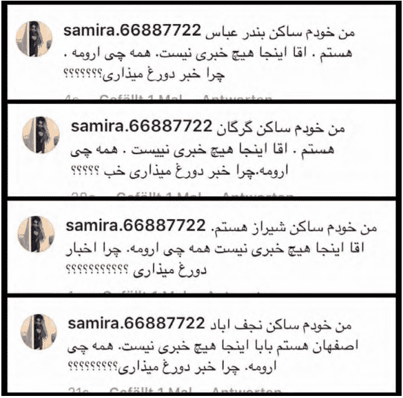 Le message dit : « Je viens de Bandar Abbas. Mec, il ne se passe rien ici. Tout est calme ici. Pourquoi publiez-vous des mensonges ? » Et le même message est répété textuellement en prétendant provenir de Gorgan (nord de l’Iran), Chiraz (sud-centre de l’Iran) et Najafabad (centre de l’Iran).